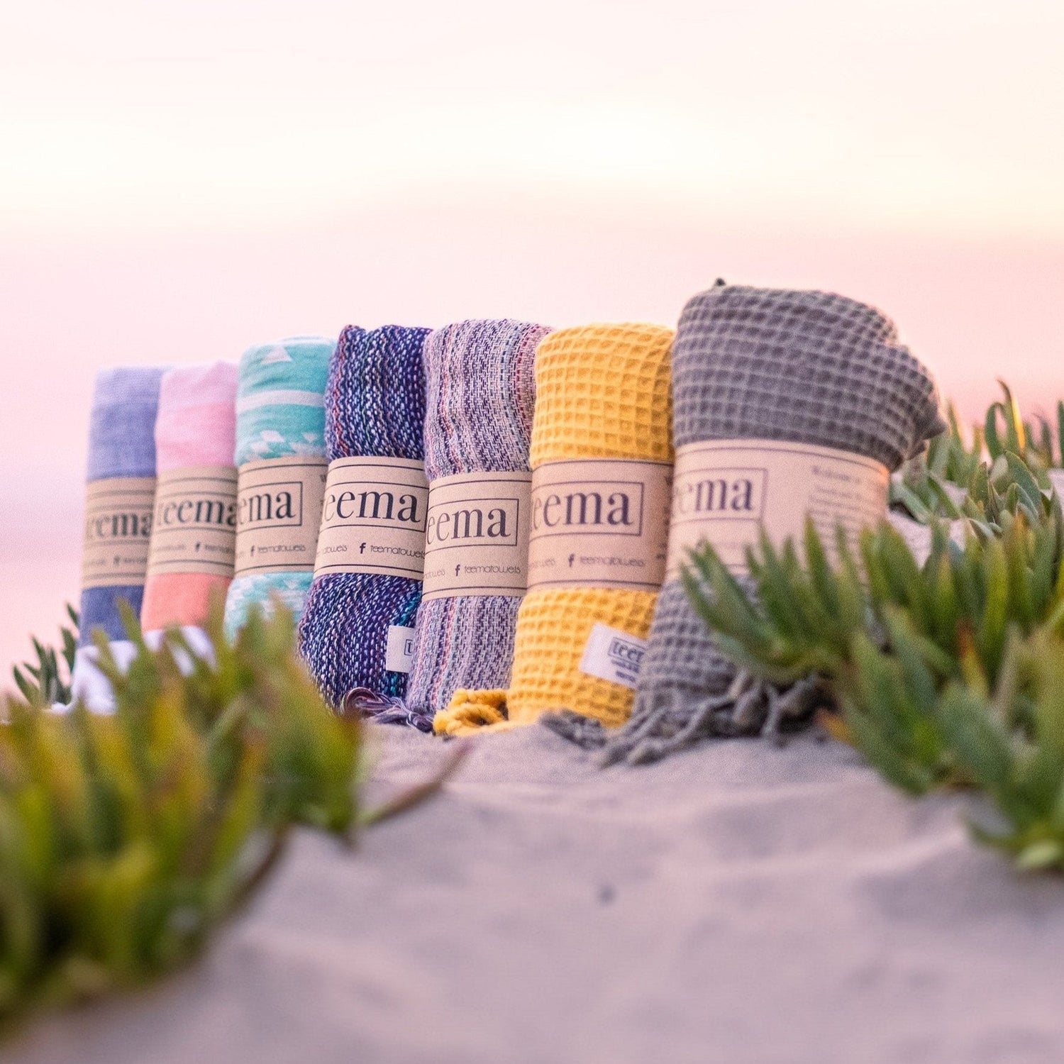 Teemas are Turkish towels, which are flat woven unlike traditional terry cloth towels, and hand crafted from 100% organic Turkish cotton. This makes our towels sand repellant, fast drying, super portable, and incredibly versatile. All of our Turish towels can double as a blanket, a scarf, a shawl, a wrap and more.